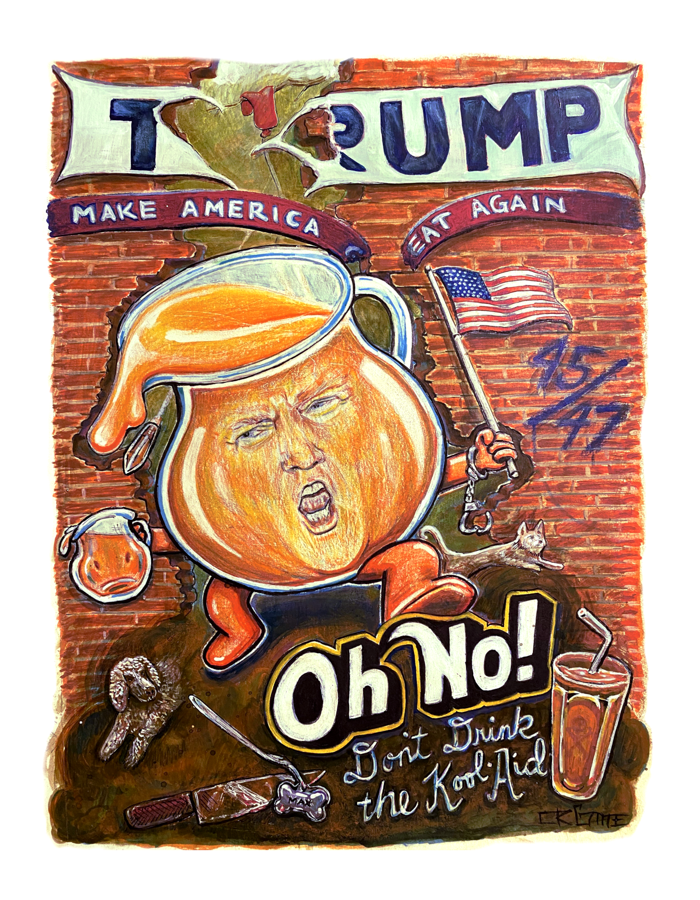 Don't Drink The Kool-Aid" by CROME is an illustration depicting Trump as the Kool-Aid man, but ORANGE flavored, busting through a brick wall while holding a miniature kool-aid man frowning & slightly spilling in his right hand, while dodging a bullet on his right side paired with him holding an american flag, while cuffs dangle off his wrist, meanwhile a dog and cat jumping through the wall with him that escaped Ohio. On the left just under the American Flag reads: 45/47 in blue spray paint on the brick wall, and in the background a red balloon hangs deflated over a branch in a tree that shows beyond a ragged and ripped Trump banner that reads "Make America Eat Again" because it is ripped in center, hiding the gr in great. This is a satire that reads "Oh No!" in the Kool-Aid style font and also in title case cursive all hand illustrated by the artist "Don't Drink The Kool-Aid" with a tall glass of orange kool-ad with a straw next to it.